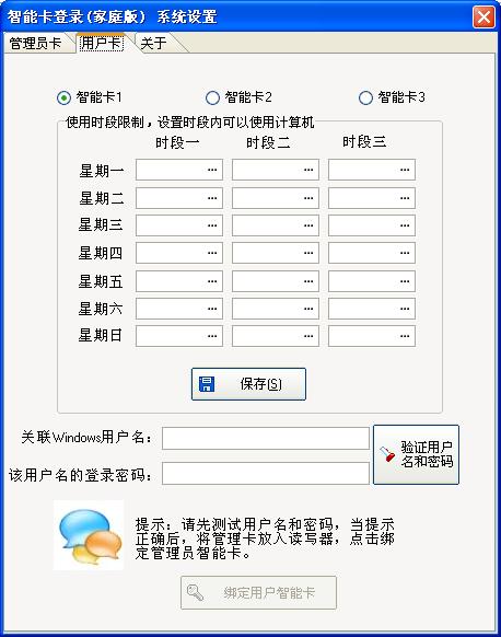 设置好所有的时间后,请输入与该用户卡关联的计算机用户名和密码,此用户名可以是任何用户或者是受限制的用户,一旦验证成功后,将智能卡放置与登录器,点击绑定用户智能卡,系统将提示成功信息。
