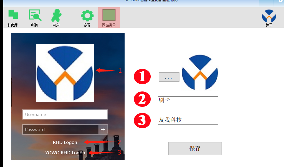 点击界面设置,可以配置登录显示的图标和对应的文字,如果插上了读卡器,则登录界面不显示用户名和密码输入框。只有在没有插入读卡器的情况下,才会显示用户名和密码输入框
