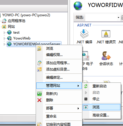 所有配置如上所示,点击确定,在左侧网站列表中生成了一个以YOWORFIDWinLogonServer的网站.