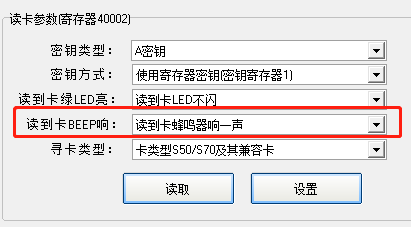 选择蜂鸣器响一声,如果仅仅读取卡号,则每次读到卡号后,蜂鸣器会响一声, 如果选择自动读取数据,则读取数据成功后响一声。