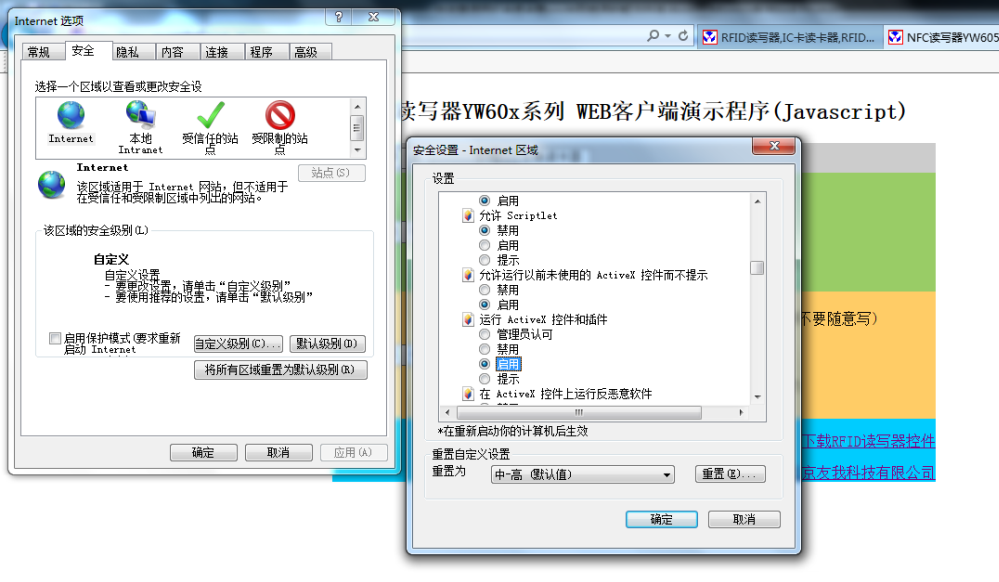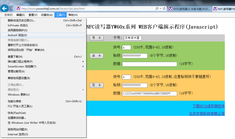 在浏览器调用友我科技IC卡读卡器ocx可能出现各种错误或者提示,一般这种提示或者错误都是设置项不合适造成的,通过调整设置项一般都能解决。本文将针对IE浏览器的各种提示和错误提出各种应对的解决方法。