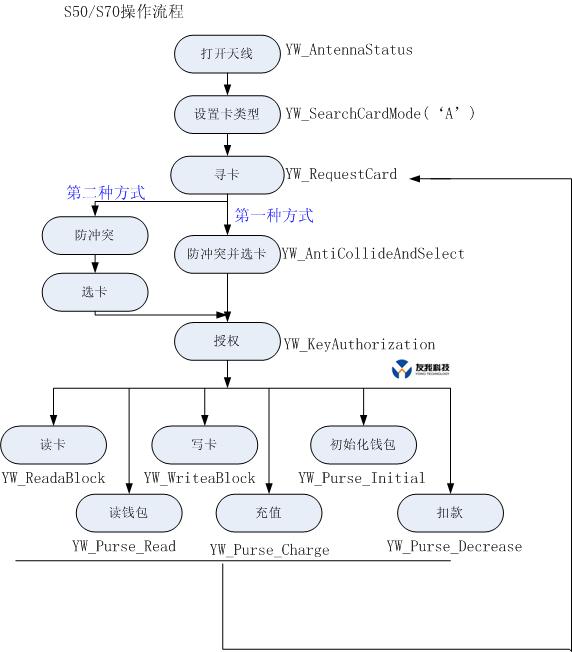 YW605在所有卡操作之前必须打开天线,读完卡后可关闭天线,也可以不关闭天线。对卡的操作流程如下图所示: