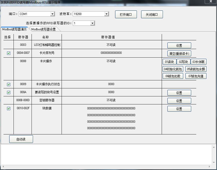 为了验证和演示modbus读写器YW-630的所有功能,友我科技还发布了类似于组态软件的演示软件,可以在计算机上完全演示读写器操作IC卡的全部过程,使得用户在开发PLC程序时走更少的弯路,缩短项目工期。
